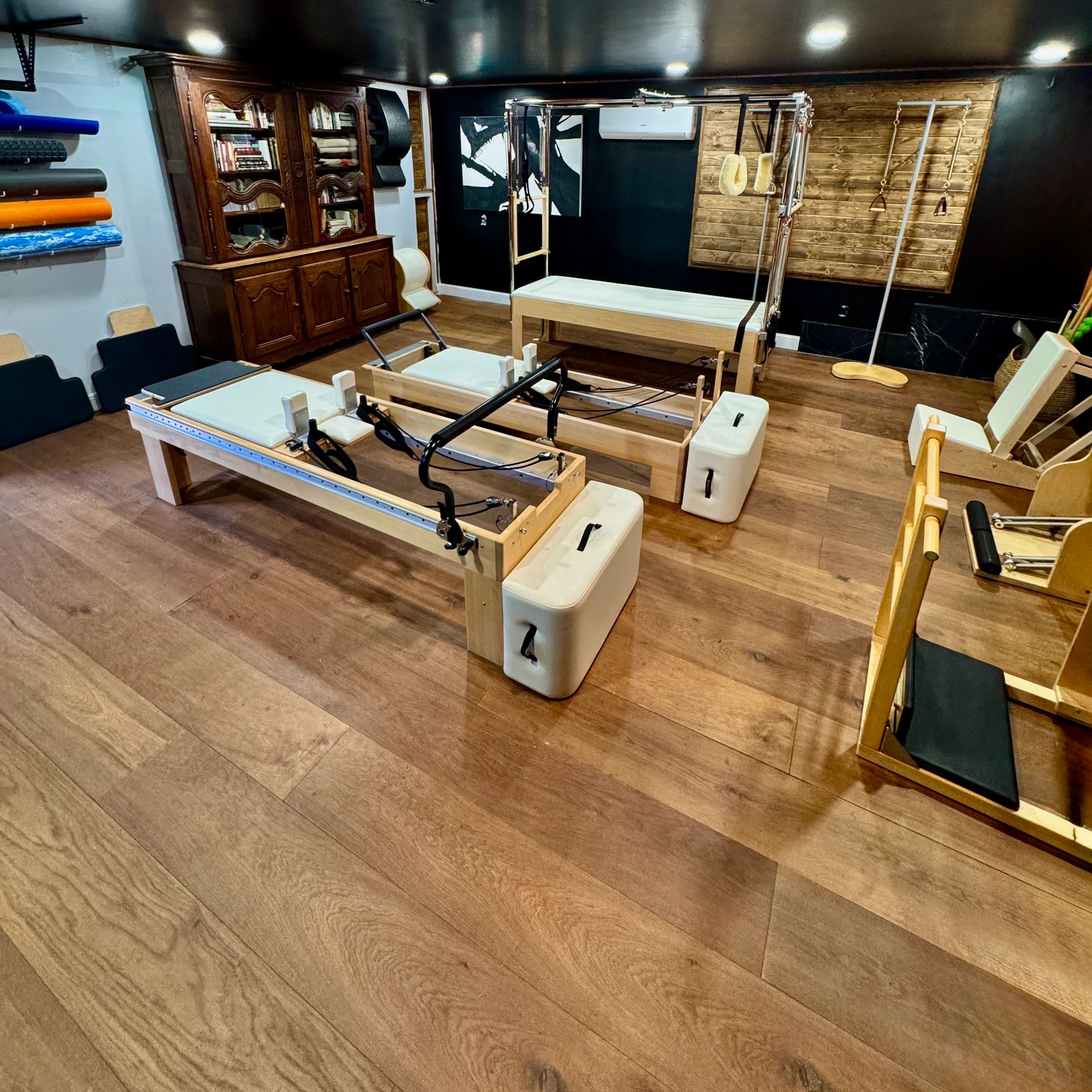 Equipment Pilates involves using specialized machines like the Reformer, Cadillac, Combo Chair and Pedi-Pole to add resistance and variety to the exercises. These machines allow for a wider range of motion and can be adjusted to different fitness levels, providing a more dynamic, full-body workout.